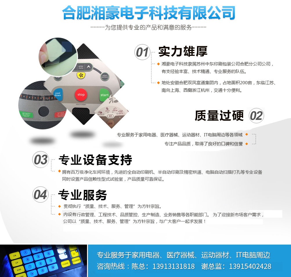 公司簡(jiǎn)介 合肥湘豪電子科技有限公司系香港中意國(guó)際集團(tuán)股份有限公司(1998年創(chuàng)建)下屬企業(yè),關(guān)系企業(yè)有:東莞中意塑膠制品有限公司(1996年創(chuàng)建),蘇州中意塑膠制品有限公司(2003年創(chuàng)建),蘇州中東包裝印刷有限公司(2007創(chuàng)建),蘇州捷瑞達(dá)自動(dòng)化科技有限公司(2014年創(chuàng)建),東莞唯道實(shí)業(yè)有限公司(2014年創(chuàng)建),合肥六九機(jī)器人自動(dòng)化科技有限公司(2015年創(chuàng)建);合作企業(yè)有:香港富通工業(yè)集團(tuán)。 公司總部設(shè)在經(jīng)濟(jì)發(fā)達(dá)的香港,總公司這十幾年來(lái)先后在東莞,蘇州投資設(shè)廠,為滿足合肥市場(chǎng)廣大客戶的需求,總公司于2015年與香港富通工業(yè)集團(tuán)合作在合肥投資設(shè)廠,打造電器控制面板,薄膜開(kāi)關(guān)業(yè)界的航空母艦,創(chuàng)造專(zhuān)業(yè)產(chǎn)品,樹(shù)立精品觀念,鍛造高品質(zhì)、高服務(wù)的企業(yè)形象,樹(shù)立正確的核心價(jià)值觀。全心全意為國(guó)內(nèi)外品牌企業(yè)服...榮譽(yù)資質(zhì)